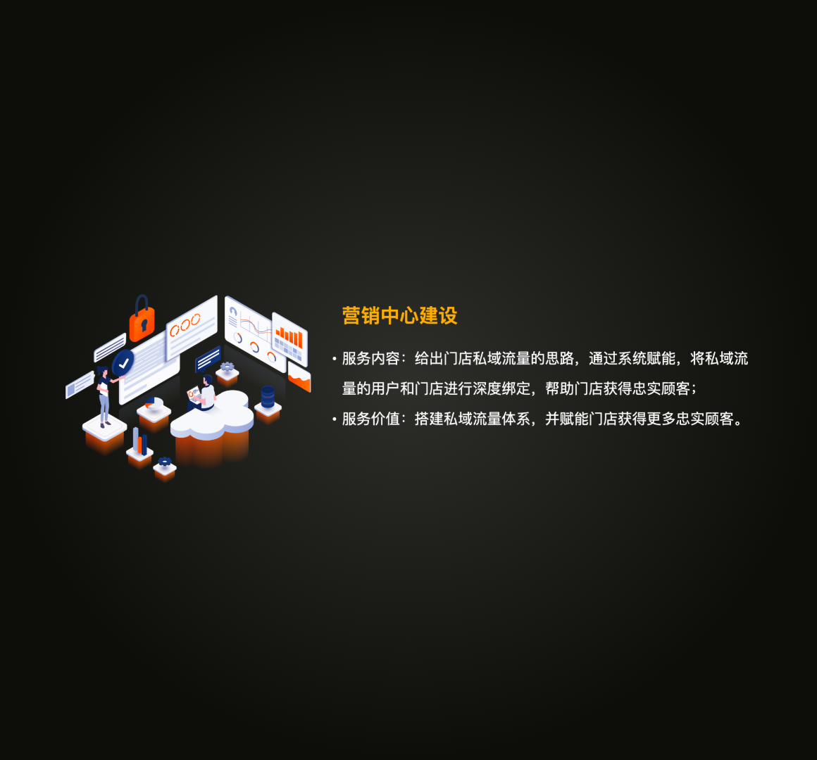 - 服务内容:给出门店私域流量的思路,通过系统赋能,将私域流量的用户和门店进行深度绑定,帮助门店获得忠实顾客;