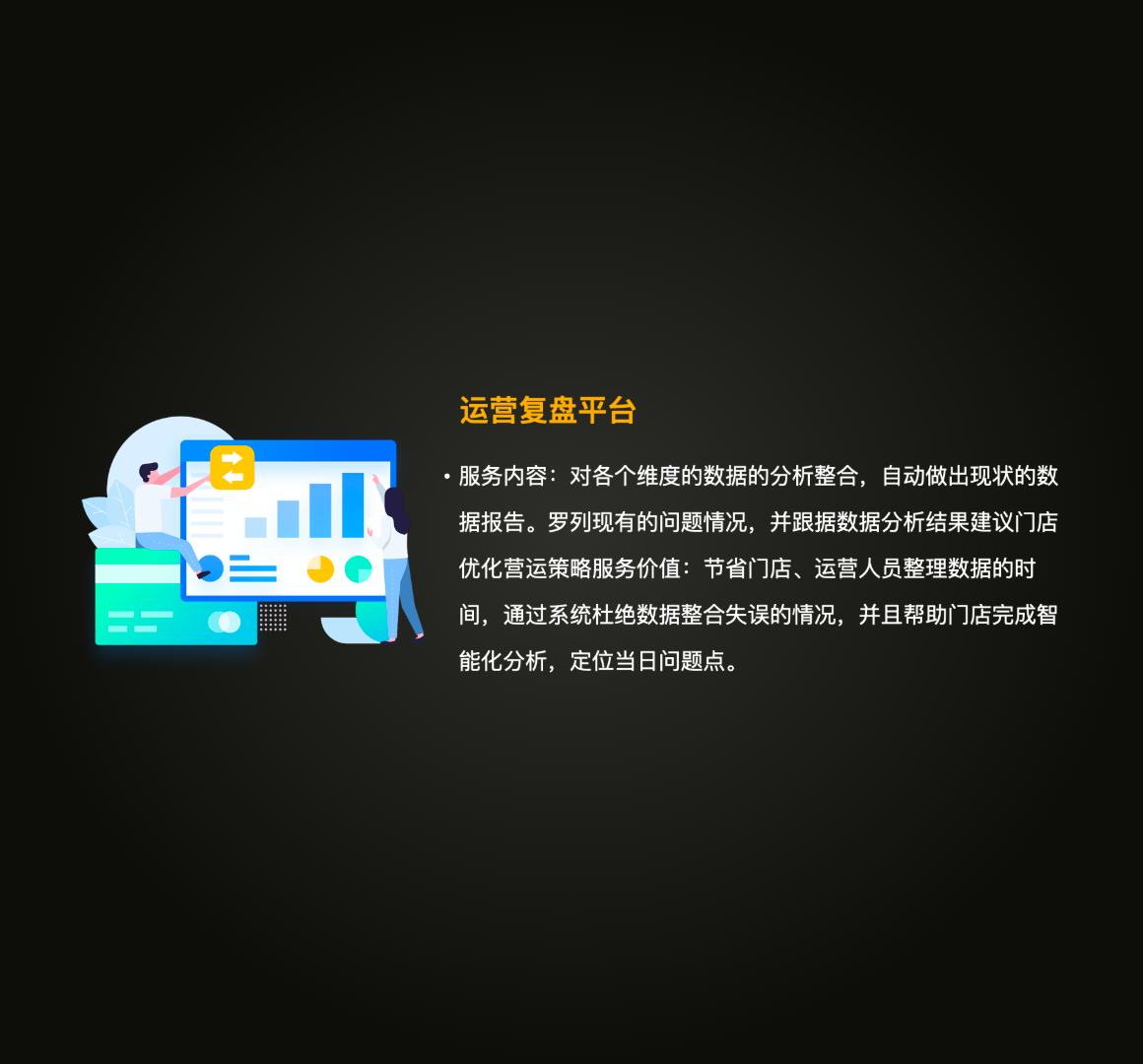 - 服务内容:对各个维度的数据的分析整合,自动做出现状的数据报告。罗列现有的问题情况,并跟据数据分析结果建议门店优化营运策略